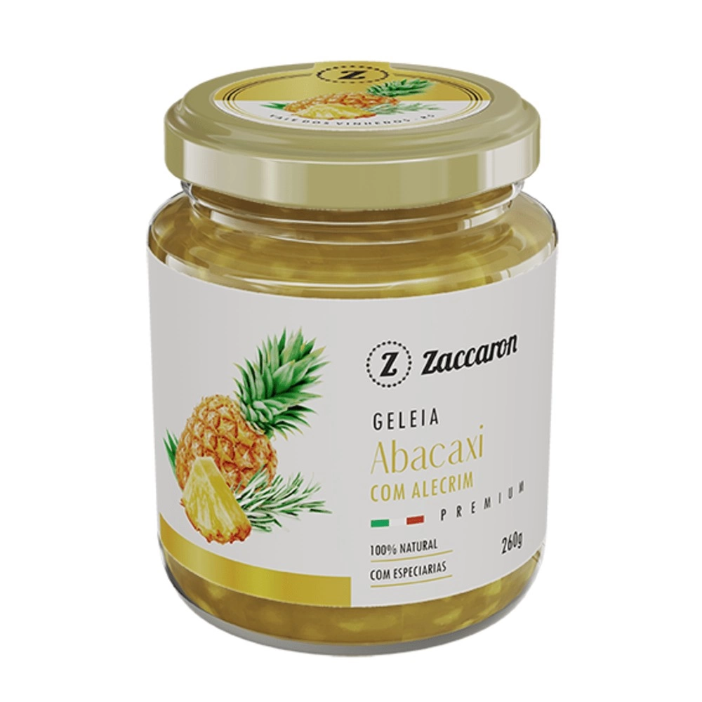 A Geleia de Abacaxi e Alecrim Zaccaron 260g combina a doçura tropical do abacaxi com o aroma marcante do alecrim feita com frutas selecionadas e temperos naturais, resulta em textura cremosa e sabor equilibrado. Versátil, é perfeita para acompanhar pães, torradas, queijos, carnes grelhadas ou como toque especial em sobremesas trazendo sofisticação e criatividade às refeições. Produzida com ingredientes de alta qualidade e preparo artesanal, preserva frescor, aroma e sabor autêntico da fruta. A embalagem de 260 g é prática e elegante ideal para uso diário ou para compor mesas e momentos especiais.