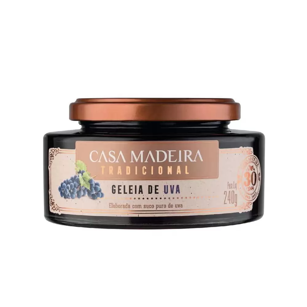 A Geleia de Uva Tradicional Casa Madeira 240g traz o sabor intenso e natural da uva em uma receita artesanal refinada feita com frutas selecionadas e preparo cuidadoso, apresenta textura cremosa e equilíbrio perfeito entre doçura e acidez. Versátil, é ideal para acompanhar pães, torradas, bolos e sobremesas, além de harmonizar com queijos e pratos gourmet adicionando sofisticação e sabor às refeições. Produzida com ingredientes de alta qualidade e tradição Casa Madeira, preserva frescor, aroma e autenticidade em cada colherada. A embalagem de 240 g é prática e elegante perfeita para uso no dia a dia ou para compor mesas especiais.